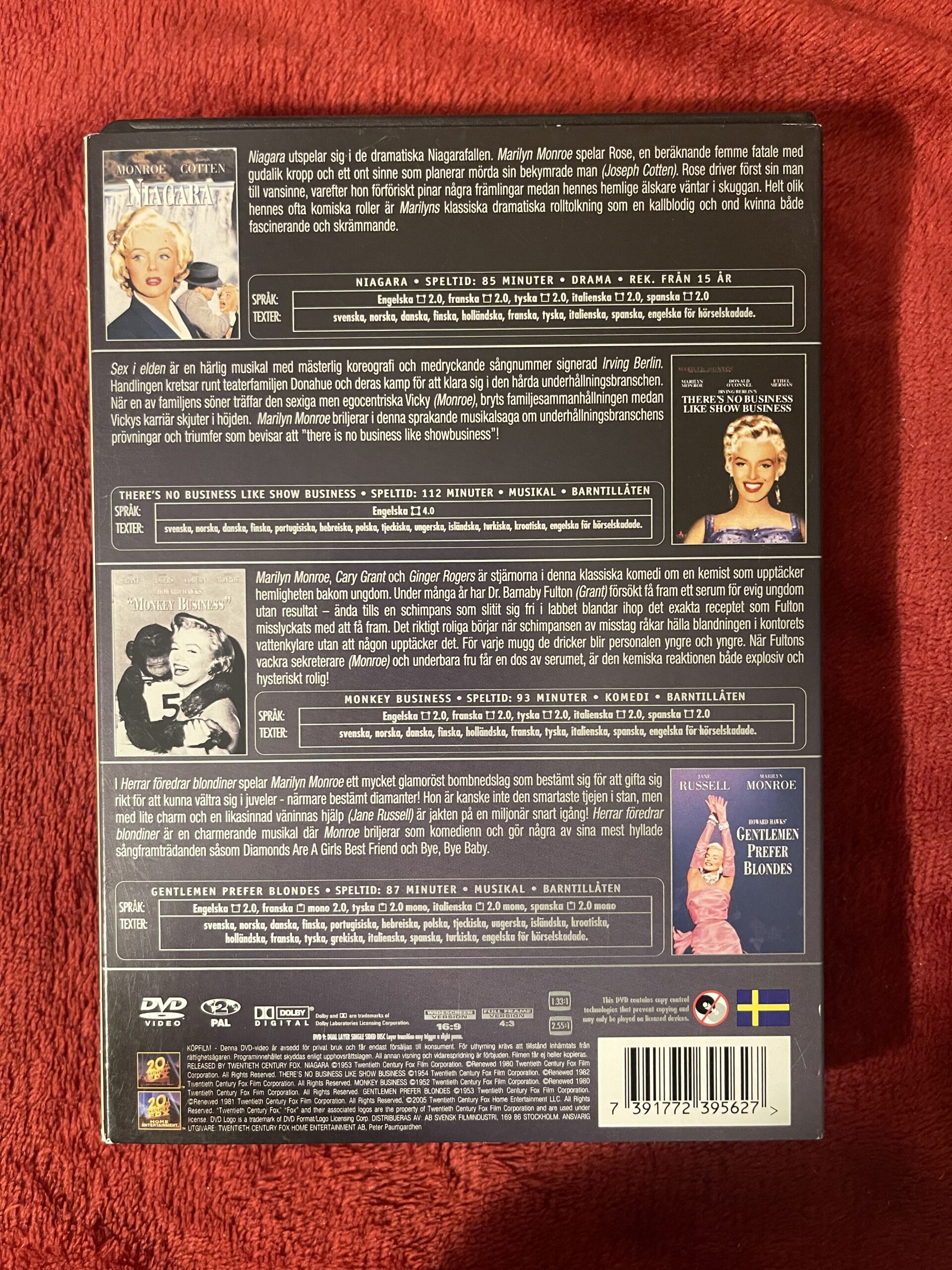 Nu har du chansen att lägga vantarna på en fantastisk samlingsbox med en av filmhistoriens mest ikoniska stjärnor – Marilyn Monroe The Collection Part 1. Detta är en exklusiv DVD-box från 20th Century Fox som innehåller fyra klassiska filmer där Marilyn Monroe briljerar i några av sina mest minnesvärda roller. En perfekt samling för filmälskare, samlare och fans av klassisk Hollywood.