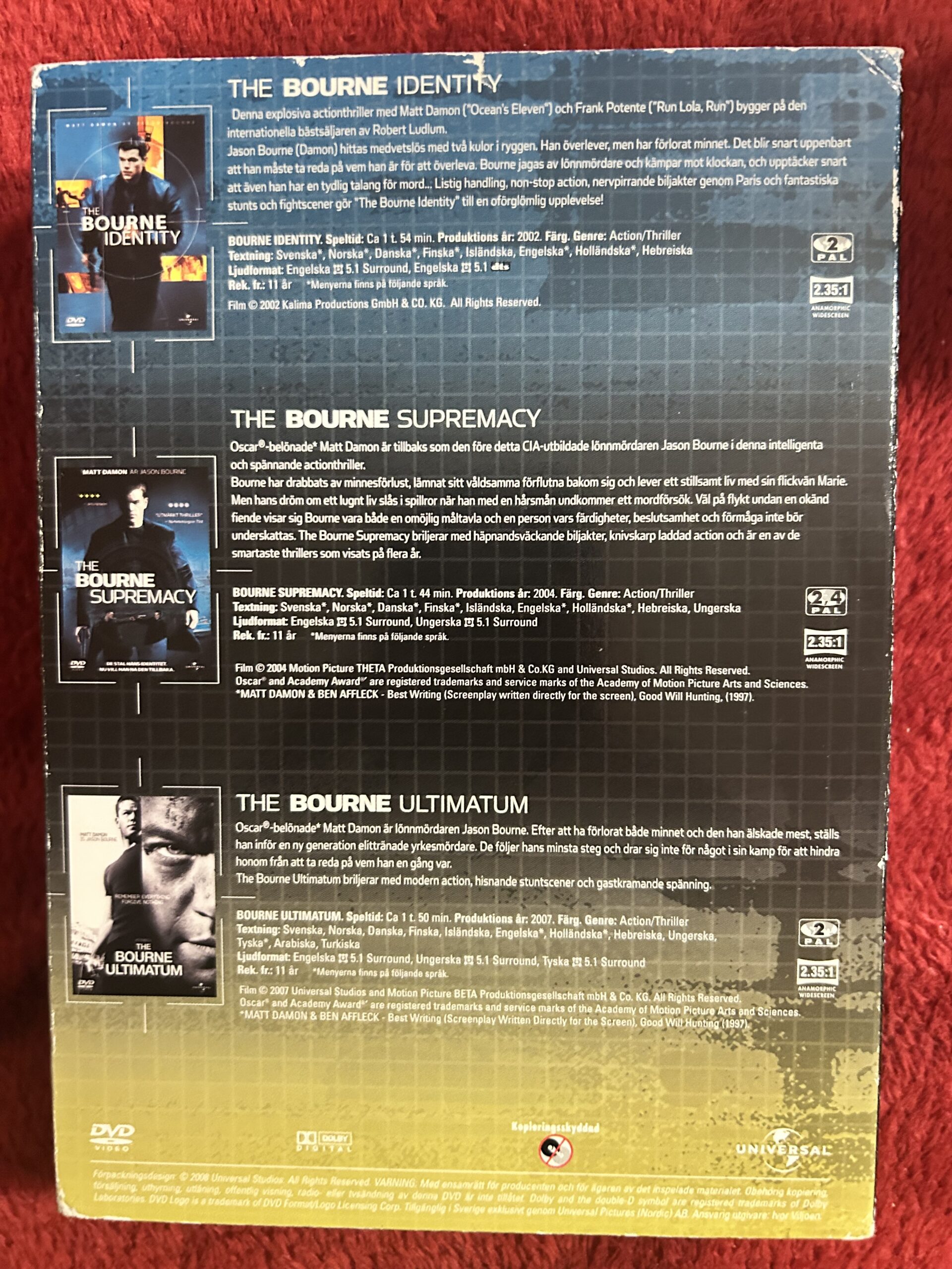 Säljer The Bourne Trilogy på DVD – en av de mest hyllade actionserierna genom tiderna med Matt Damon i huvudrollen som Jason Bourne. Perfekt för dig som älskar spänning, agentfilmer och intensiva thrillers.